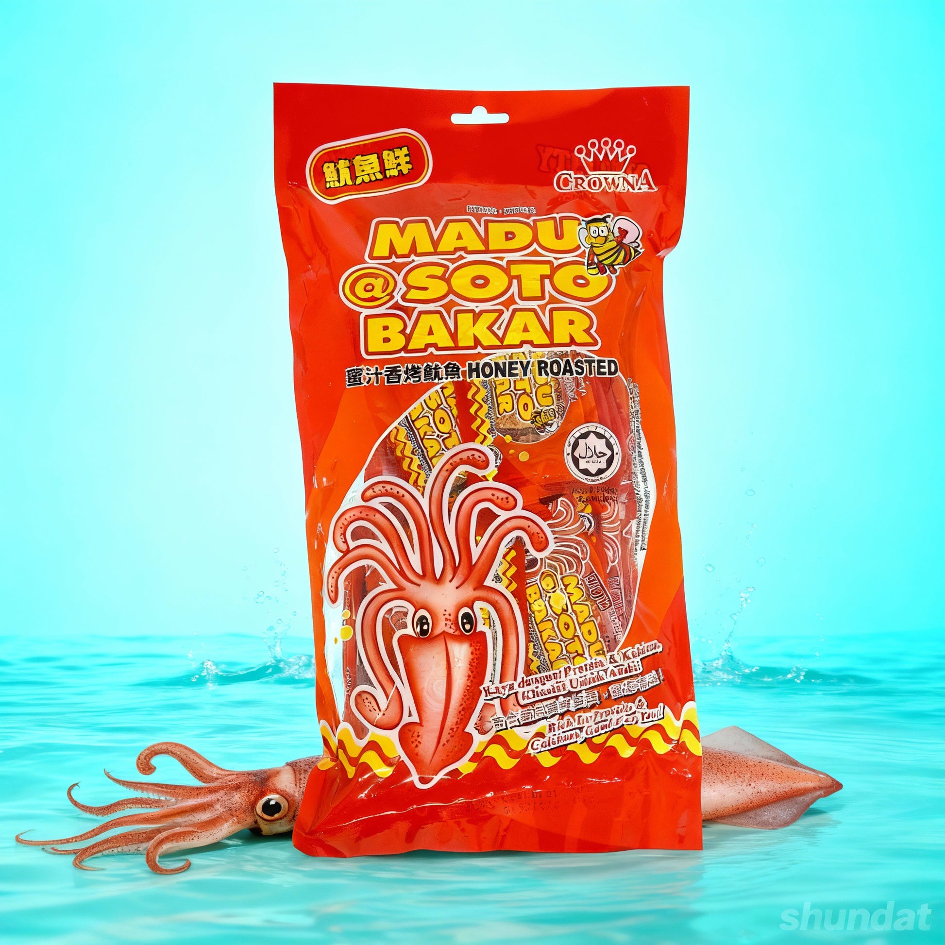 Get hooked on the irresistible taste of Crowna Madu @ Soto Bakar, the all-time favourite honey roasted squid snack! Each strip is infused with a unique blend of sweet honey glaze and savoury roasted flavour, giving you that chewy, smoky, and aromatic bite you can’t resist.