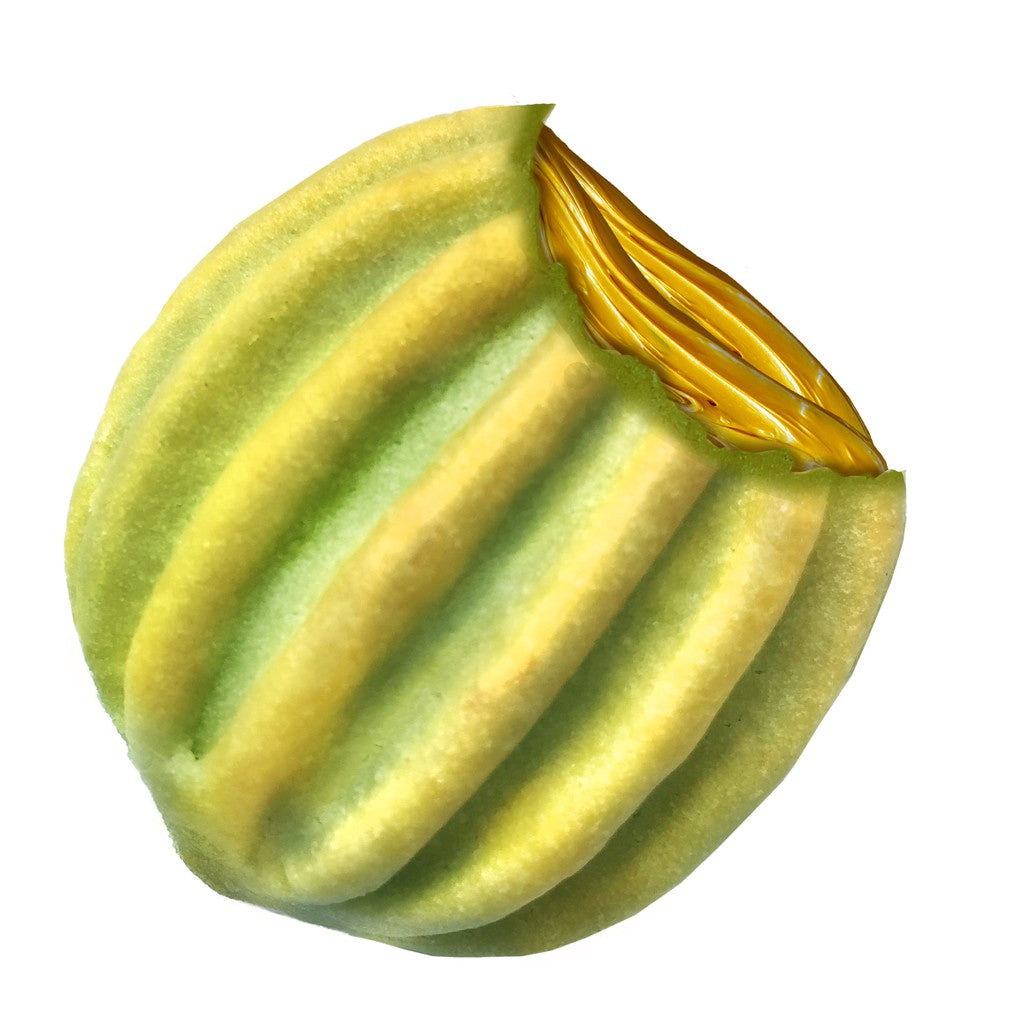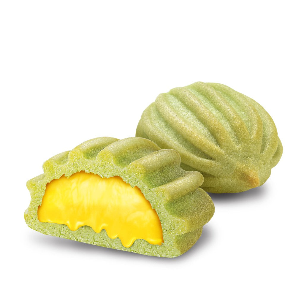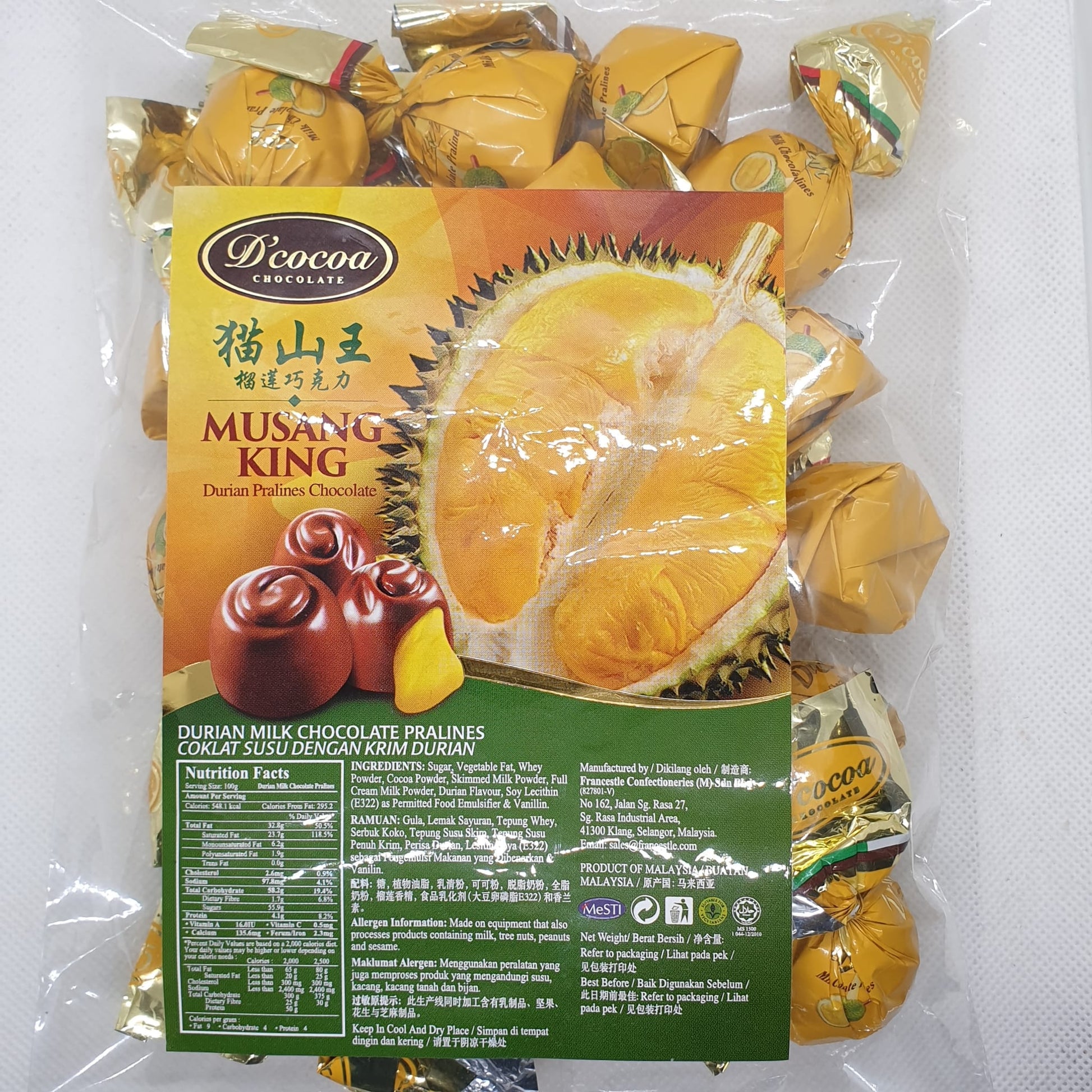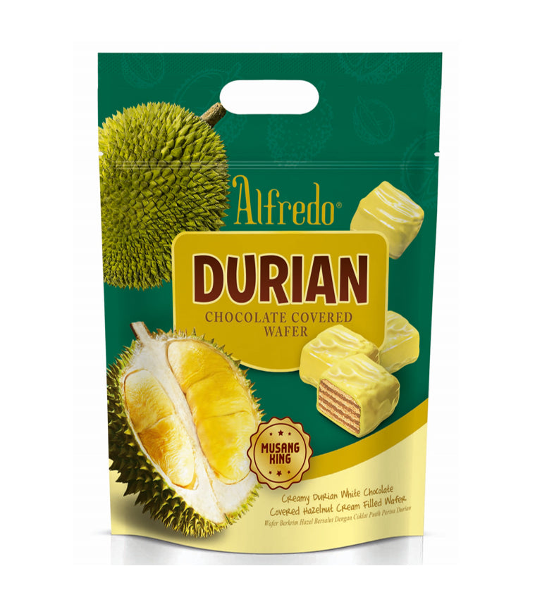Creamy durian white chocolate covered hazelnut cream filled wafer.